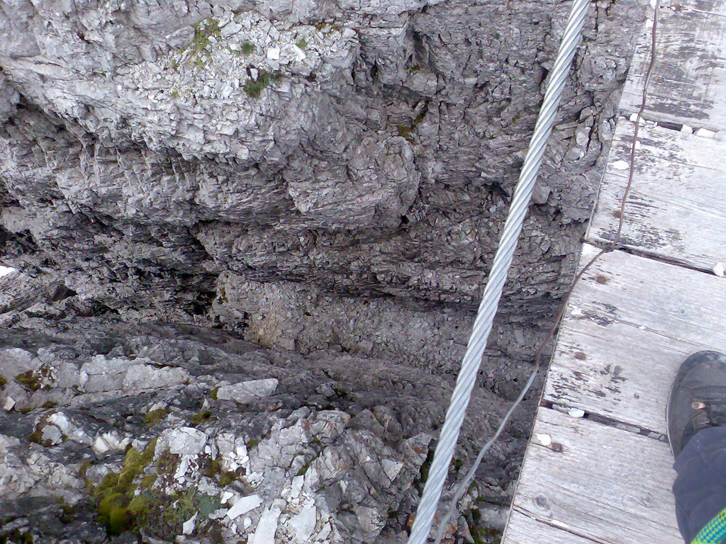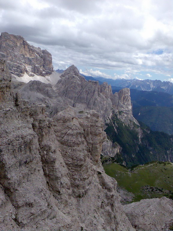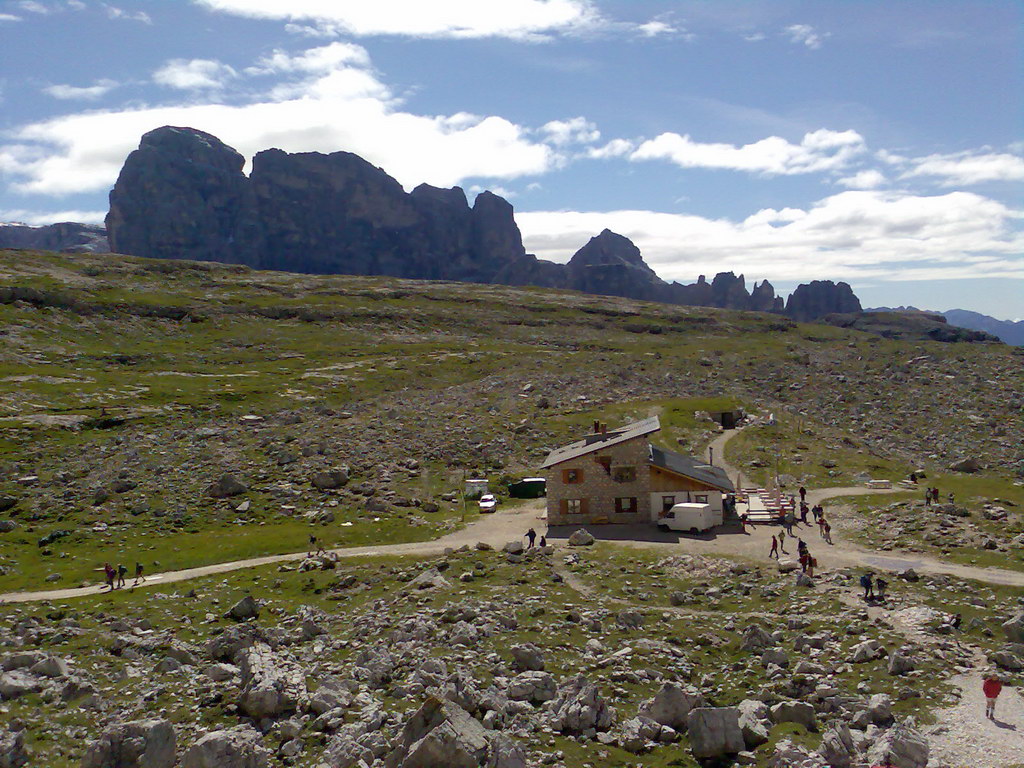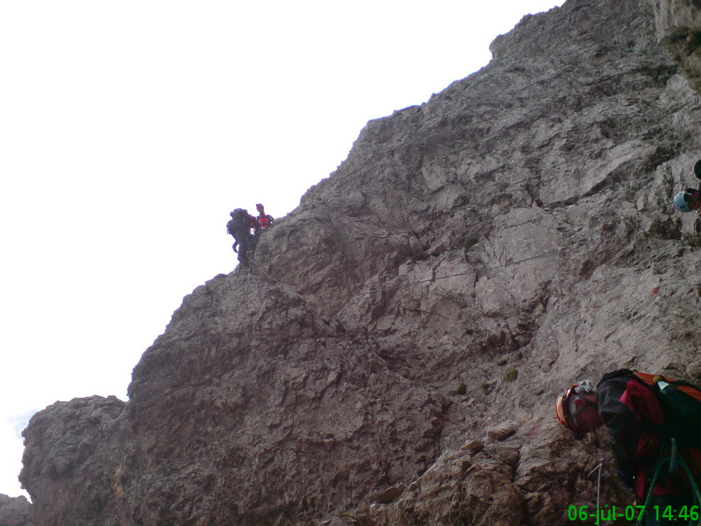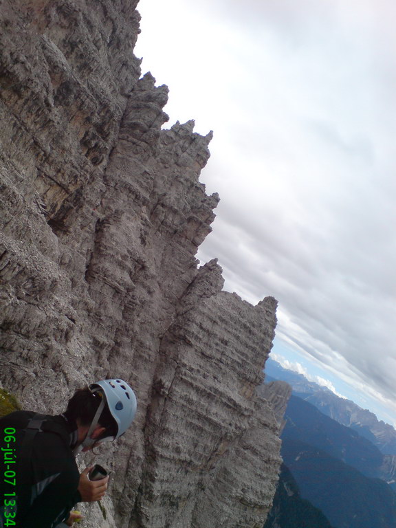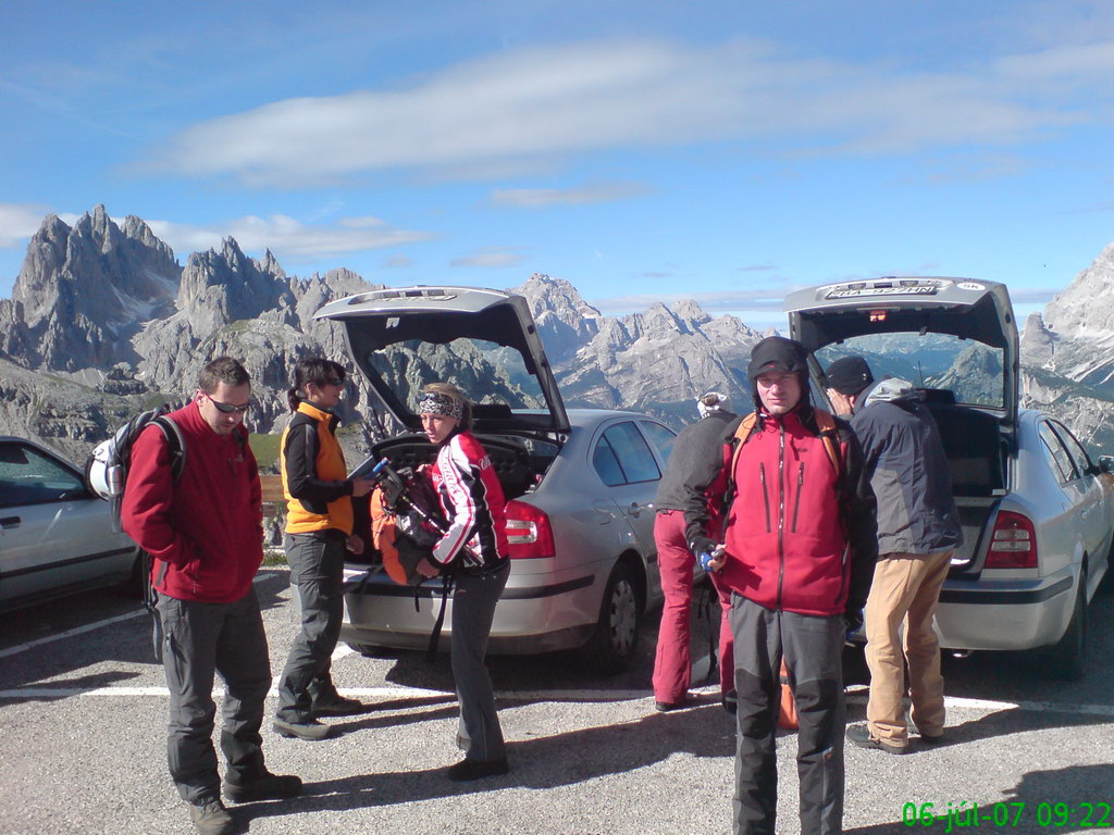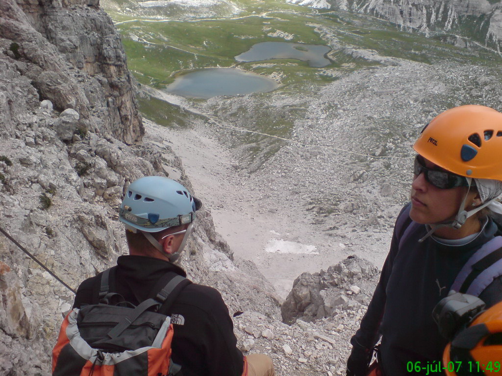 Vyrazili sme ako vždy ráno o siedmej , dnes nás čakala trocha dlhšia cesta. Po dvoch hodinách počúvania The Bridge sme došli na parkovisko pri Rifugio Auronzo. Privítal nás studený vietor, tak sme sa nezdržiavali a rýchlym tempom vykročili. Cesta na chatu Rifugio Lavaredo je nenáročná, jediným problémom sú zástupy prevažne sviatočných turistov. Na chate sa chvíľu zdržíme a vydávame sa k východisku dnešnej feraty. Spočiatku stúpame dosť prudkým svahom až kým nevyjdeme na rovné priestranstvo, odkiaľ je nádherný výhľad na majestátny Drei Zinnen. Po suťovisku pokračujeme asi 3 kilometre k nástupu na feratu. Navliekame si výstroj, tentokrát aj s čelovkami a vyrážame. Spočiatku stúpame do kopca tunelom, stúpanie je dosť zdĺhavé a v tomto stiesnenom priestore nie veľmi príjemné. Po asi pol hodinke prichádzame na skalnú plošinu, kde začína samotná ferata. Pripútame sa k istiacemu lanu a vo včerajšom poradí vyrážame. Jedná sa o obojsmernú feratu, takže postup nahor komplikujú zostupujúci. Ako vždy nebojácni bratia česi, aby sa nezdržiavali čakaním, zostupujú bez zaistenia snehovým poľom. Jeden z nich precenil svoje schopnosti a zo zúfalým "co teď" sa so zúfalou prosbou v očiach díval na svojho parťáka. Nakoniec sa mu to nejako podarilo a bezpečne zostúpil. Táto ferata je nenáročná, jediný problém je množstvo ľudí. V sedle ferata končí a na vrchol je to za pár minút. My s K sme sa trocha zdržali, na 2744 m vysoký Paternkofel prichádzame ako poslední z našej skupiny. Ledva stihneme zopár vrcholových fotiek a Mišo nás kvôli počasiu tradične plaší dole. S K frfleme ale nakoniec sa podriaďujeme. Tou istou trasou klesáme nadol. Nájdeme si príhodné miestečko na posilnenie a rozbalíme obed. Pri jedle pozorujeme iných bratov čechov s igráčkovskými prilbami. Naspäť sa vydávame inou trasou, rovnako zabezpečenou oceľovým lanom. Niektoré úseky sú pomerne exponované, ale ako už skúsení feratisti s tým nemáme žiadny problém. Po asi hodine a pol si vyberieme zostupovú trasu suťoviskom. Cesta nám dáva dosť zabrať, nohy nemajú pevný podklad, čo zaťažuje najmä kolená. Po asi pol hodinke prichádzame na cestu. Záverečné, dosť vyčerpávajúce stúpanie a ocitáme sa pri malom plese za chatou Rifugio Lavaredo. Na chate sa osviežime kolou, sadáme do auta a vyrážame do Cortiny. Dnes sme to stihli tesne po sieste, nachádzame útulnú pizzeriu a na verande usadáme k stolu. Pizza a cestoviny sú vynikajúce a tak spokojní odchádzame. Prejdeme sa ešte po mestečku, nakupujeme zásoby a suveníry v miestnom obchodnom stredisku. Sadáme do áut a vraciame sa do Pederoy.