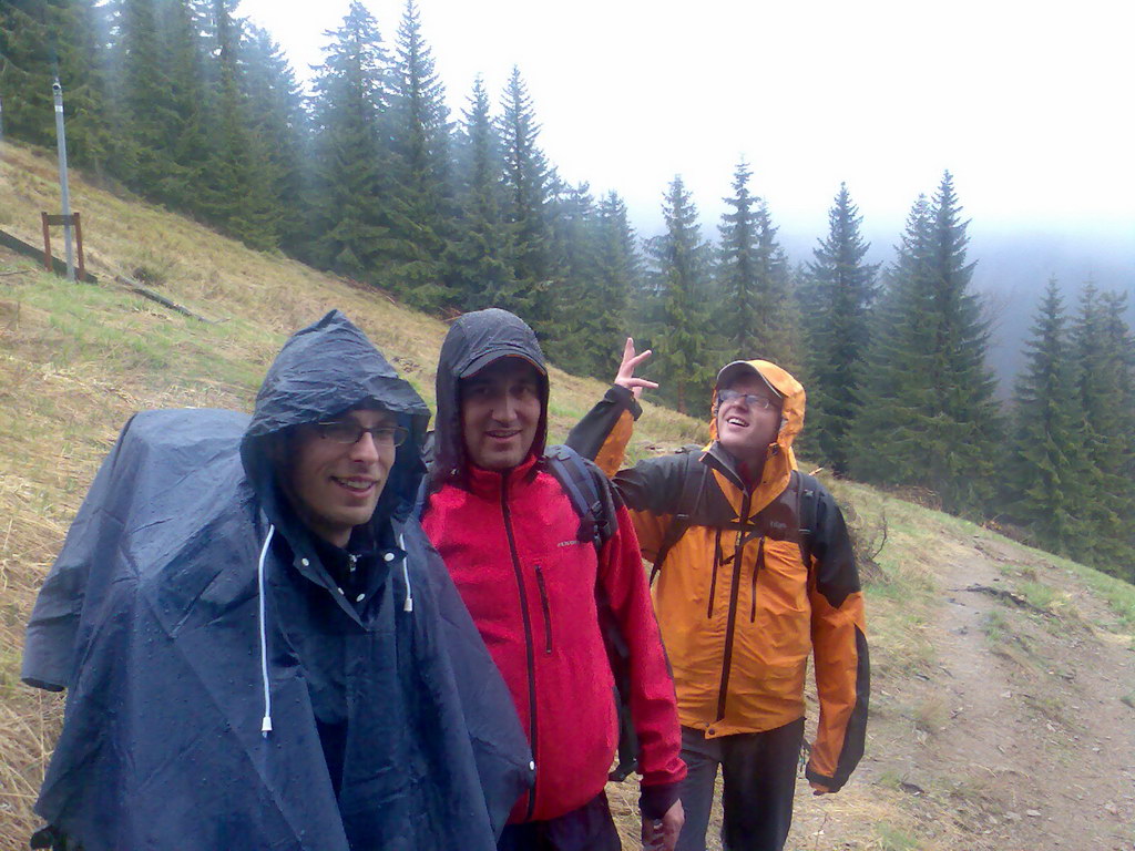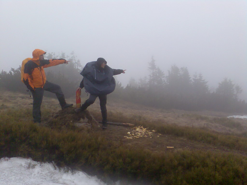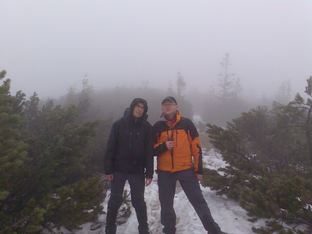 Na túto minihrebeňovku sme sa dohodli aj s našim dávnym kamarátom Julesom. Boli sme trocha v časovej tiesni /Kamienku mali od budúceho týždňa reštaurovať a my sme chceli stihnúť aspoň trocha zimné podmienky/ a tak sme sa vybrali aj za nie veľmi priaznivého počasia. Po všelijakých peripetiách sme sa nakoniec všetci stretli v Brezne a začali vymetať podniky... Na privát u Č, kde sme spali, sme sa dostali asi okolo 2 nadránom, na spánok sme mali slabé 4 hodinky. Ráno budíček, niektorým sa nechcelo vstávať a došlo aj k ostrým slovným výmenám. Nakoniec sme však včas stihli autobus a dopravili sa na Čertovicu. Tu sme vošli do motoresta a naraňajkovali sa. Objednali sme si obľúbené mccainy /placky/. Boli extrémne mastné, dokonca aj po odsávaní oleja servítkami. Aspoň budeme mať dosť energie na šlapanie. Vonku sa riadne rozpršalo, preto si obliekame pršiplášte, robíme záverečné fotky s čašníčkou a vyrážame do dažďa. Z Čertovice na Rovienky je to riadny stupák a v tomto rozbahnenom teréne to teda nie je med lízať. Po pol hodinke K začína vážne uvažovať o návrate, tepláky má načisto premočené. Pokúšame sa ho odhovoriť a presvedčiť, aby to s nami vydržal aspoň po Štefáničku. Chvíľu s nami ešte kráča, ale nakoniec sa rozhodne vrátiť. Takže už len traja vchádzame na Rovienky a po červenej kráčame kosodrevinou ďalej. Na Kumštové sedlo je to 20 minút viac-menej po rovinke. V hmle a miernom mrholení prichádzame na sedlo, chata je vzdialená už len 1:15 hod. Chôdza v mokrom snehu je dosť nepríjemná ale s krátkymi prestávkami sme to nakoniec zvládli. Na chate nás privítala usmievavá pani chatárka s ochrankou - pardálom Bagírom. Naobedovali sme sa, ubytovali a vrátili späť do reštaurácie. Okrem nás bolo na chate už len zopár hostí. Začali sme teda hodovať a popíjať. Okolo desiatej pani chatárka zavrela kuchyňu a pobrala sa spať, nám však dovolila ostať v jedálni a ďalej sa zabávať. Tak sme aj učinili, keď sme okolo 11 v noci vyšli von, obloha sa roztiahla a v diaľke sme zahliadli svetlá Brezna. Opäť po polnoci sme sa vybrali na izbu, ráno sme museli skoro vstávať, mali sme v pláne zažiť svitanie na Ďumbieri. Okolo 3 zazvonil K povestný budík, na ktorý sa zobudila celá chata okrem K. Vonku však pršalo a tak sme zaľahli spať.