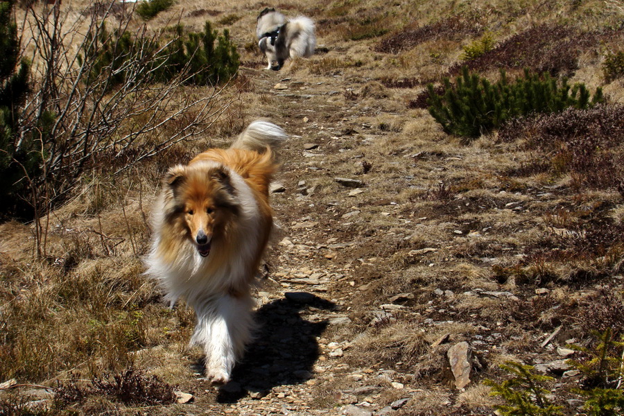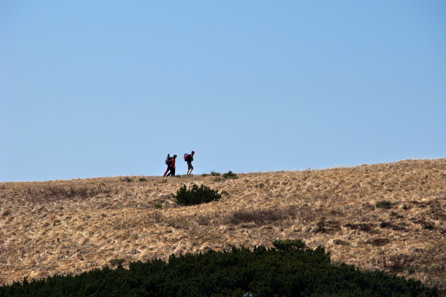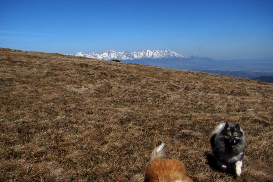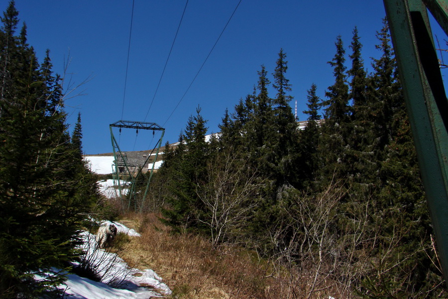 V tomto nekrytom teréne je sila vetra omnoho vyššia ako v nižších polohách, ale vďaka slnečnému počasiu a nášmu oblečeniu je to znesiteľné. Záverečné stúpanie na Kráľovu hoľu je pomerne monotónne, našťastie však neustále sa zväčšujúca silueta kráľovohoľského vysielača postaveného v roku 1 960 pôsobí motivujúco. Po cca 40 minútach dosiahneme vrchol a najvyšší vrch východnej časti Nízkych Tatier nám odhalí svoju jedinečnú kruhovú panorámu. Vychutnávame si výhľad na Vysoké a Západné Tatry, vrcholky Nízkych Tatier, Horehronie a Liptov. Okrem vysielača v budove sídlia aj meteorológovia a členovia Horskej záchrannej služby. V malej miestnosti, celoročne otvorenej a určenej na núdzové prespatie, si čakanie na Ďuriho, ktorý sa s jeho roztomilou kóliou Rebelom vydal na hľadanie geokešky umiestnenej na Orlovej, krátime suchým obedom. Po príchode dvojice geocacherov sa zbalíme a vydáme sa na cestu dole.