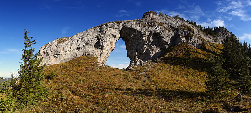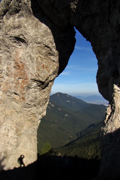 Po chladnej a vlhkej októbrovej noci, keď Suunto ukazovali v kolibe na veľkej poľane teplotu + 0º C, sme sa skrehnutí prebrali do slnečného rána. Rýchlo sme sa naraňajkovali, zbalili a vyrazili z útulne smerom k hríbiku na Prednej Poľane, ktorý je označený Pod Ohnišťom. Odtiaľ vedie zelená značka prevažne ihličnatým porastom až na samotné Ohnište. Po cca 20 minútach sme dorazili k hríbiku Ohnište, ktorý je vybavený vrcholovou knihou. Po skúsenosti z roku 2 008 (viď odkaz nižšie), keď sa nám skalné okno nepodarilo nájsť, sme sa tentoraz nemienili vrátiť bez toho, aby sme sa nevyfotili v najvyššom a asi aj najväčšom skalnom okne na Slovensku. Nešli sme teda po najviac vychodenom chodníčku, ktorý od hríbika odbáča doprava, ale skúšali sme sa k Oknu priblížiť zhora, po krasovej plošine. Čoskoro sme však zistili, že tadiaľto je ďalší postup nemožný a vrátili sme sa na vyšliapaný chodníček.