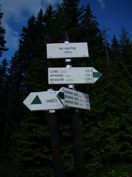 Silné slnko nás zobudilo veľmi zavčasu. Dopriali sme si bohaté raňajky a v kľude si ešte oddýchli. O pol ôsmej sme zobudili K, ktorému sa v obave pred medvedím atakom podarilo zaspať až nad ránom, zbalili sa, popratali okolie a pripravili na cestu. Rozlúčili sme sa s Michalom, ktorému bolestivý priehlavok neumožňoval pokračovať ďalej. Michal zostúpil do Malužinej, kde vyčkával na naše pokyny ohľadom presunu autom do Michalova. Popod ihličnany sme sa vydali smerom na Ohnište. Čakalo nás vyše 400 metrové prevýšenie. Výstup kamenistým a koreňmi posiatym príkrym svahom bol dosť náročný a preto každý postupoval tempom, ktoré mu vyhovovalo. Počkali sme sa pri hríbiku Pod Ohnišťom. K a K dokonca predbehla masa českých seniorov, ktorí sa do Malužinej dopravili autobusom. Na krásnej čistinke sa kvôli kvantám lietajúceho bodavého hmyzu nedalo ani natiahnuť a tak sme s Dušan-bem netrpezlivo očakávali zvyšok skupiny. Od hríbika na Ohnište to trvalo už len 20 minút, postupovali sme malebným lesom mierne do kopca. Na Ohništi boli samozrejme strategicky rozmiestnení seniori a tak sme schovali batohy pod papradím porastom a vydali sa na obhliadku masívu. Vyšľapaný chodníček traverzuje popod bralo, takže vyhýbanie sa oprotiidúcim turistom je mierne komplikované. Cestou sme minuli povestné skalné okno /aspoň sme si to mysleli.../, chodník však pokračoval ďalej a my teda tiež. Zastavili sme sa až keď sa nám terén zdal dosť nebezpečný. Oddýchli sme si, vychutnávajúc výhľad na centrálny hrebeň Nízkych Tatier a okolité doliny. Cestou späť sme sa odfotili v skalnom okne. /až doma pri prezeraní fotiek z Rovnej hole sme zistili, že Okno sme ani nevideli, mali sme ešte pokračovať náročným terénom a cca po 200 m by sme ho našli.../. Po návrate na hríbik pri Ohništi sme si dali výborný Dušan-beho makovník a pokračovali v túre. Až po Michalovské sedlo sme neustále klesali, od sedla nás čakalo ešte vyše 100 m stúpanie na Slemä. V tejto horúčave to nebolo nič príjemné, nakoniec sme to však úspešne absolvovali. Od hríbika sme šli asi ešte asi päť minút doľava a došli sme ku troskám nákladného lietadla z druhej svetovej vojny. Nachádzajú sa tu informačné tabule popisujúce tragickú udalosť. Zo Slemä na Brtkovicu vedie traverzové klesanie ihličnatým lesom. Cca v poslednej tretine je nutné sa predierať hustým vysokým malinčím, ktoré môže mať za následok stratu vecí pripevnených zvonka k ruksaku /ako sa stalo Č, našťastie však zvyšok skupiny po telefonáte pozorne sledoval chodník a špeciálnu Atilovu fľašu s vodou našiel/. V malinčí sa nachádza aj partizánsky bunker /opäť s informačnou tabuľou/. Z Brtkovice túra vedie pomerne nezáživným terénom po širokej poľnej ceste. Voláme Michala, aby nám autom šiel naproti. Po chvíli pokyny rušíme, keďže cesta je miestami nezjazdná. Míňame salaš so smerovníkom. Nakoniec vychádzame popri rekrečných chatách, nesprávne odbočíme doprava a po moste vchádzame na lúku. Vyčerpaní z horúčavy voláme Miša a nútime ho aby porušil zákaz vjazdu a prišiel pre nás. Asi po 15 minútach už počujeme auto a naradostení nasadáme. Cestou do Lendaka sa ešte zastavíme v motoreste s neuveriteľne rýchlou čašníčkou, dáme si teplú večeru a presúvame sa domov.