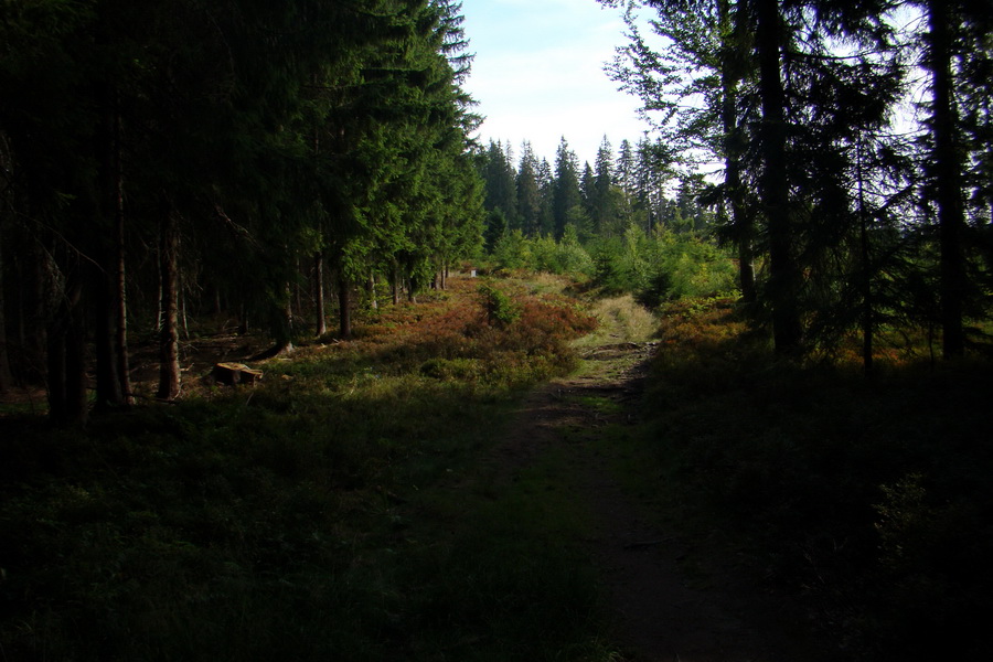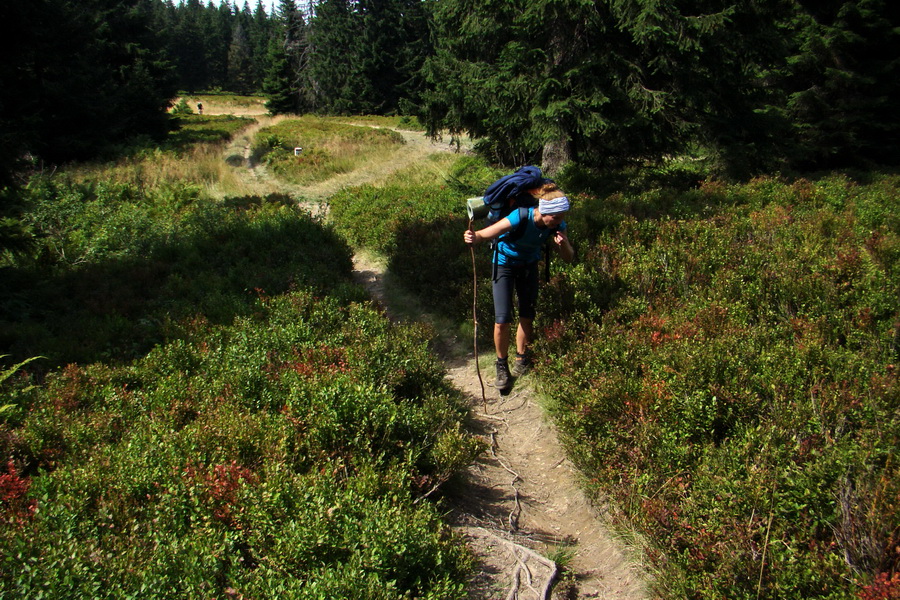 Ráno oddýchnutí sa rýchlo naraňajkujeme, zbalíme stan a vyrazíme od Bacówky popri kalvárii naspäť na modrú značku. Chodník spočiatku mierne stúpa, po strmšom výstupe prichádzame na 1 132 m vysokú Hrubú Bučinu, z ktorej je výhľad na Pilsko. Pokračujeme zostupom, po čase míňame tabuľku s nápisom OBSZAR NATURA 2000 BESKID ZYWIECKI (prírodná rezervácia Zywiecke Beskydy) a prechádzame čistinkou. Pôda začína mať miestami bažinatý charakter, problematickejšie úseky sú zabezpečené drevenými doskami. Po prekonaní tohto úseku prichádzame k smerovníku Mútňanské sedlo. Po chvíli oddychu začíname prudko stúpať až kým nedorazíme na vrch Magurka, ktorý nie je nijak vyznačený. Po ďalších cca 500 dĺžkových metroch prichádzame na turistickú križovatku Trzy Kopce, ktorá prepája turistické chaty na poľane Hala Rysianka a poľane Hala Miziowa. Nemáme naponáhlo a tak sa skladáme pri hraničnom kameni a oddychujeme. Božské ticho je občas prerušované výkrikmi zberačov čučoriedok, ktoré prichádzajú zo smeru nášho ďalšieho postupu.