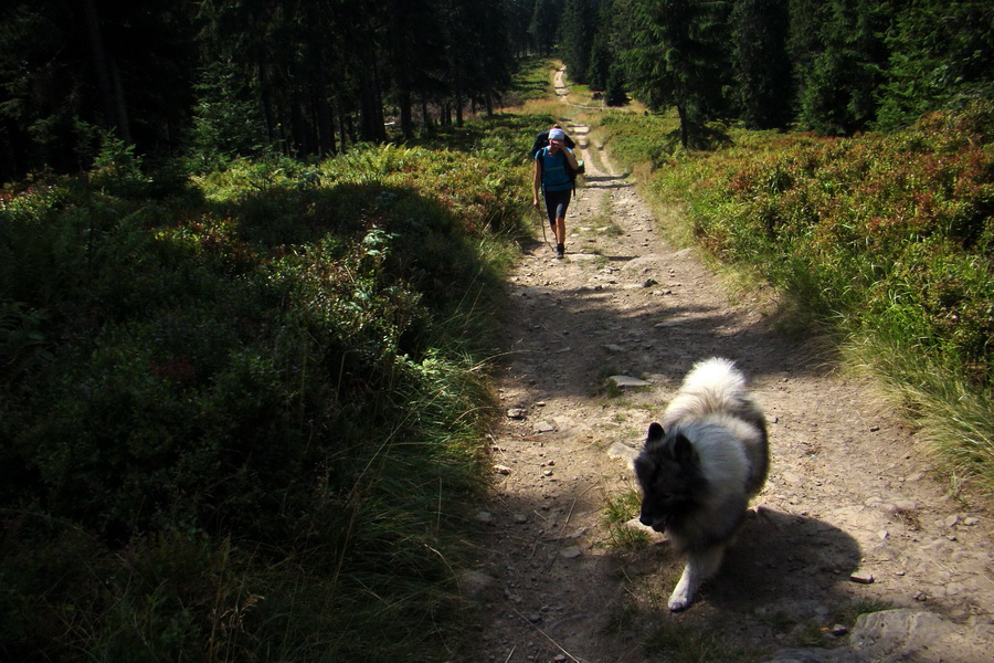 Suunto ukazujú 39°C, ukladáme sa teda do tieňa ku kosodrevine, oddychujeme a vychutnávame si výhľady. Na chatu sa zostupujeme tou istou cestou, z kosodreviny vyťahujeme našťastie neporušené batohy a po žltej značke klesáme k chate. Vidina chladeného piva, sprchy a postele nám zostup značne uľahčuje. Dvojposteľová izba so sprchou na jednu noc stála 100 zł, psa nám neúčtovali. Výdatne sme sa najedli v jedálni a vychutnali si pivo na lavičkách pred chatou. Chata je viacpodlažná, na prízemí sa okrem recepcie nachádza aj priestranná "verejná" kuchynka s rýchlovarnou konvicou na varenie čaju či kávy.
