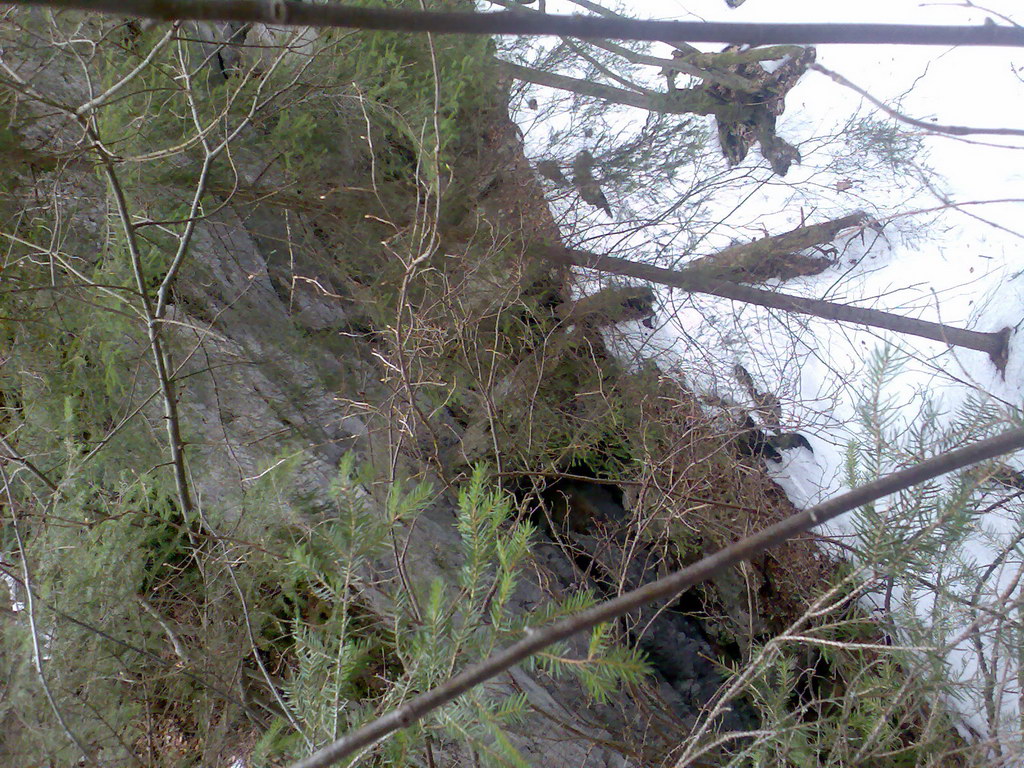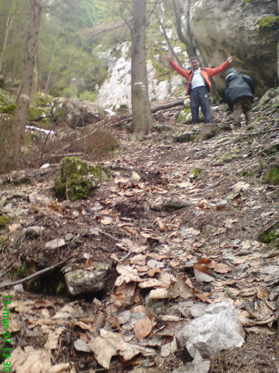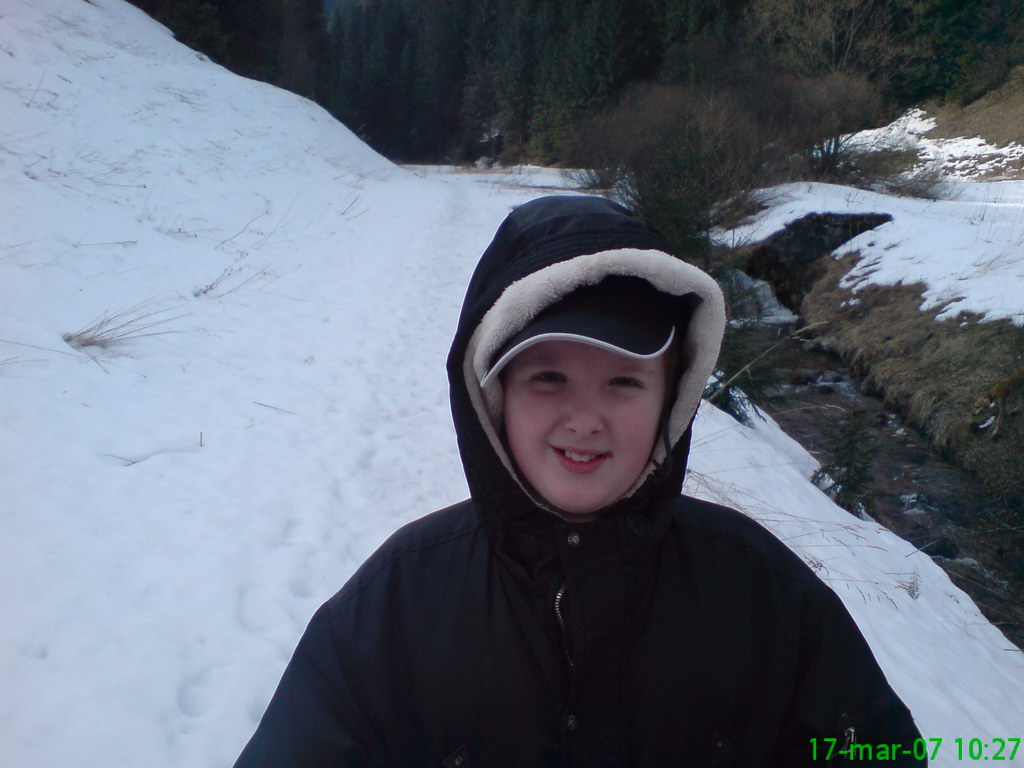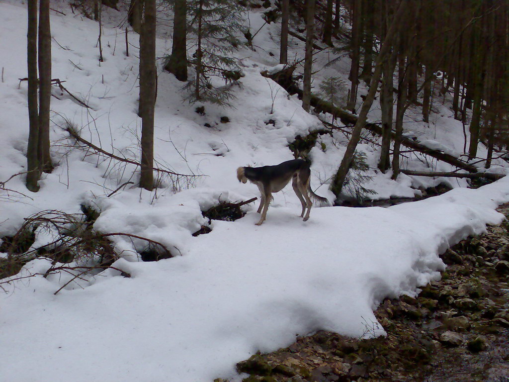 Na nenáročnú túru v južnej časti Slovenského raja sme zobrali okrem psov aj K potomka - Výhula. V kombinácii krčmy a potravín v Stratenej sme nakúpili proviant a vrátili sa k hríbiku. Prešli sme popod kamenný most a popri potoku sa vydali po modrej značke. Burzum sa cestou ešte schladil v ľadovom potoku. Prešli sme dreveným rebríkom cez potok, po pár metroch následoval ďalší, uľahčujúci stúpanie hore kopcom. Kráčali sme opatrne, úzky chodník bol pokrytý zľadovatelým snehom. Nachádzali sme sa v malebnom prostredí, potôčik zurčal pod nami, v hlbokej, úzkej skalnej roklinke. Čoskoro následoval kovový mostík a s ním aj prvé problémy. Burzum vidiac mostík sa /ako už aj v minulosti v Slovenskom raji/ vyvliekol z obojka a ušiel do lesa. Snažili sme sa ho chytiť, ale on pred nami hravo utekal, až sme sa ocitli na začiatku túry, pri prvom drevenom rebríku. K sa podarilo nasadiť Burzumovi obojok, zatiahol ho pevnejšie a držiac Burzuma v náručí bezpečne prešli obaja cez mostík. Až po ďalší rebrík bol terén nenáročný. Rebrík viedol strmo nahor, okolitým terénom sa vyjsť nedalo. K preto zobral Burzuma na vodítko a podrobiac topánky v zábehu zaťažkávajúcej skúške, prešiel úsek potokom. Stretli sme skupinku mladých turistov z Dolnej zeme idúcich opačným smerom. Trasa kopíruje potok, bez ďalších komplikácií pomaly opúšťame roklinu. Začína stúpanie, spočiatku mierne, neskôr výraznejšie. Prechádzame krátkym úsekom po čistinke a usadíme sa pri hríbiku na oddych. Oddýchnutí sa vydávame na ďalšiu cestu. Začína prudké stúpanie komplikovaným terénom. Po pravej strane v strmom úbočí sa zjavuje otvor v skalnej stene. Testujúc nové čelovky vchádzame dnu a skúmame vlké stropy vyhĺbeniny. Páchne to tu ako v pavilóne mäsožravých šeliem v ZOO a tak s miernymi obavami z medveďa opúšťame jaskyňu. Prudké stúpanie postupne vymenilo miernejšie, avšak v ťažkom mokrom snehu. Prichádzame na čistinku, kde sa naobedujeme. Posilnení kráčame viacmenej rovinatým terénom až kým nezačneme klesať. Klesanie nasvedčuje, že sa pomaly blížime k Dobšinskej ľadovej jaskyni. Po pol hodinke už sa fotíme pred vstupom do jaskyne. V zimných mesiacoch je jaskyňa pre verejnosť uzavretá. Schádzame dolu zábradlím ohraničenými serpentínami a vychádzame na hlavnej ceste. Pôvodne sme mali v pláne sa cez Havraniu skalu a Občasný prameň vrátiť do Stratenej, ale keďže sa už zvečeriava, meníme plán. Vošli sme do reštaurácie Ľadová jaskyňa a po krátkej výmene názorov nám personál umožní usadiť sa aj so psami pri vchode do reštaurácie. Autobus v týchto hodinách do Stratenej už nejde a tak vysielame K, aby sa stopom dopravil k autu. Po čase nás kvôli záverečnej z reštaurácie vyhadzujú a presúvame sa do krčmičky s oveľa vľúdnejšou pani vedúcou. Prichádza K, ktorý nakoniec stopol poliakov, nasadáme do auta a vyrážame na spiatočnú cestu do Lendaku.