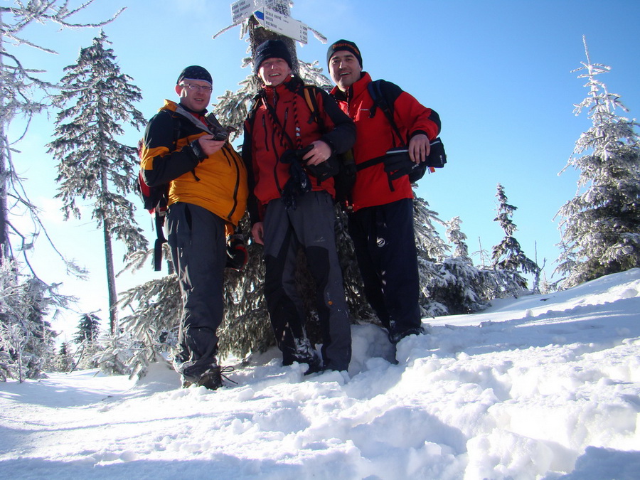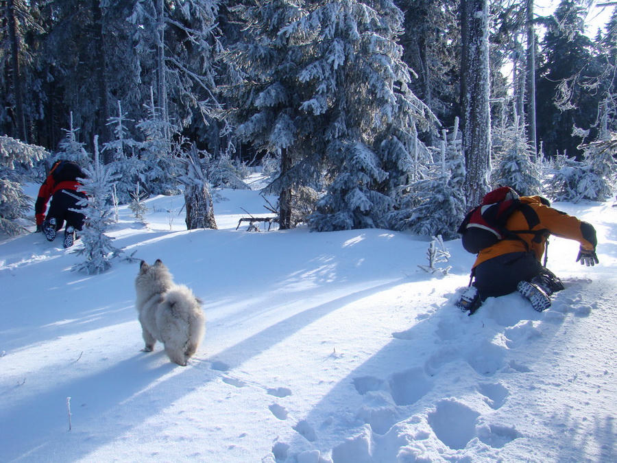 Hríbik oznamoval, že výstup bude trvať niečo vyše dvoch hodín. Čas už bol dosť pokročilý, ale odhadovali sme, že by sme mali vyvrcholiť okolo 12. Modrá značka vedie lesíkom a kopíruje zvážnicu, čo sme cestou naspäť aj celkom využili. Asi po 3/4 hodinke sa nám na rázcestiach postupne odkrývali výhľady na blízke okolie a na Vysoké Tatry v celej svojej nádhere. Viackrát sme križovali zvážnicu, až sme napokon prišli ku pňu na ktorom bola šípka doľava. Tu už sneh miestami siahal aj po kolená a náš postup sa spomalil. Po asi pol hodinke sa pred nami zjavil polom a značka sa prirodzene vytratila. Domnievali sme sa, že najlepšie bude vyšľapať na horizont, keďže náš cieľ už iste nebude ďaleko. Vyšli sme teda na víchricou zničený hrebeň a okrem prudkého vetra nás privítali úchvatné výhľady. Boli sme už vyhladovení a unavení z brodenia snehom a napadali nás zajačie úmysly. Tentokrát nás podržal K a po krátkom občerstvení za vyvráteným stromom sme pokračovali ďalej. Zišli sme do sedla a začalo ďalšie stúpanie. Sneh začínal byť miestami "vajcový", čo robilo problémy najmä urasteným K a K. Č so psami snehovú pokrývku zvládali na hranici únosnosti. Vošli sme teda do lesa a miestami nadávajúc, miestami smejúc sa z bizarnej situácie pokračovali vo výstupe. Na niektorých úsekoch K a K museli postupovať po štyroch aby rozložili svoju váhu a nezabárali sa. Takýmto spôsobom za hurónskeho smiechu konečne dosiahli vrchol. Boli už vyše 2 hodiny po poludní a ako je z nemenovaného filmu o Mount Evereste známe, je to zároveň aj najvyšší čas na návrat /zostupy v neskorších časoch spravidla končia tragicky.../. Rýchlo sme teda aj so psíkmi pojedli a vydali sa na cestu späť. Zostup na počudovanie prebiehal oveľa rýchlejšie, ako sme si mysleli, sneh už bol vyšľapaný a "vajcové" miesta zreteľne viditeľné. Pokračovali sme takmer bez zastávky až na rázcestie so zvážnicou, zišli zo značky a ďalej kráčali už len v miernom snehu. Okolo piatej sme s nohami premočenými od napadaného snehu dorazili k autu a bez ďalších prestávok vyrazili naspäť do Lendaku.