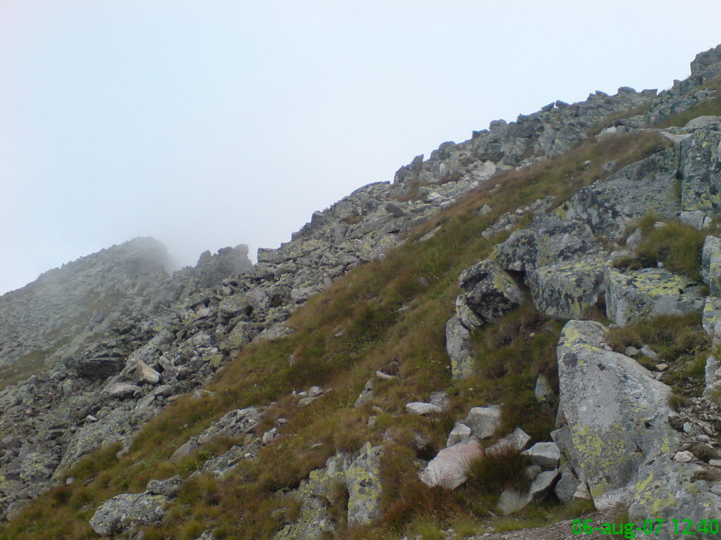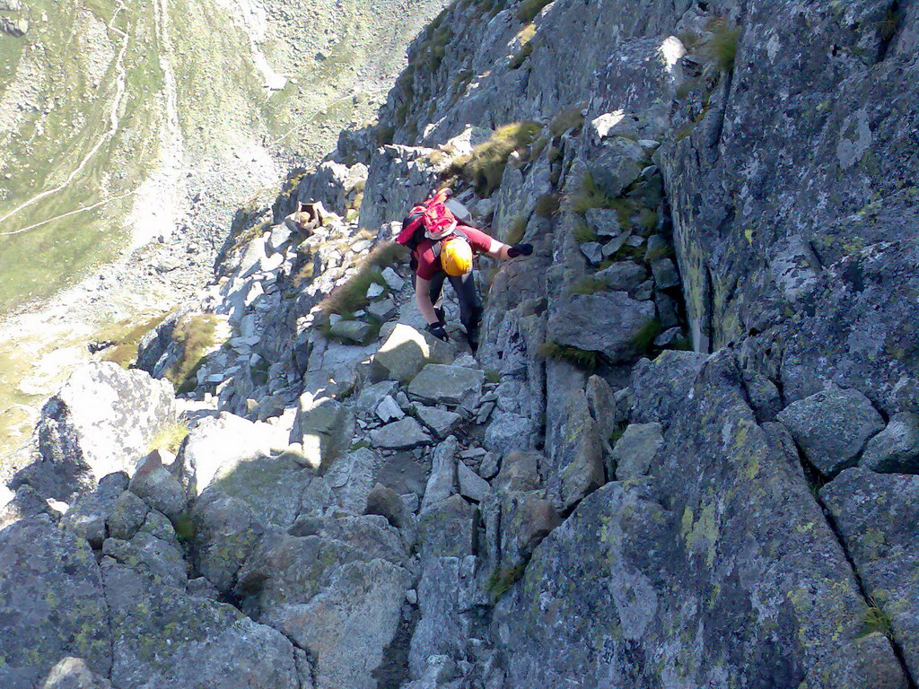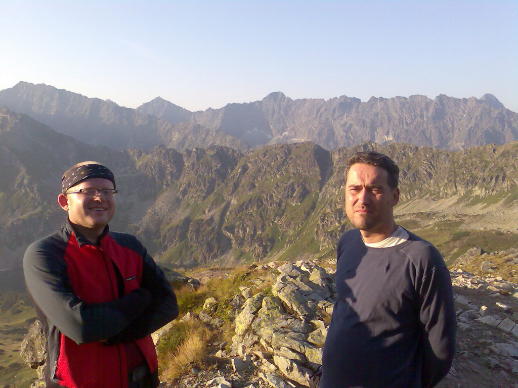 O pol piatej nás budí K prenikavé zvonenie, vonku je ešte tma a tak sa dohadujeme, že ešte si dáme pol hodinku a vyrážame. Tak sa aj stalo, použili sme exkluzívne toalety, rýchlo sa pobalili a ešte za tmy vyrazili. Prvých štyridsať minút je pohodových, prechádzame okolo 5 plies a tešíme sa na to, čo nás čaká. Cestou popíjame čaj, čo mal so sebou Č, čo sa ešte ukáže ako jeden z kľúčových faktorov. Slnko vychádza a my začíname intenzívne stúpať na sedlo Zawrat. Po chvíli sa naše tempo začína spomaľovať, K dochádzajú sily. S K ho povzbudzujeme, dodávame železnú rezervu - hroznový cukor od Miša z Dolomitov a pokračujeme ďalej. Naše povzbudzovania krízu zažehnať nepomáhajú a tak K s ťažkým srdcom zanechávame jeho osudu /v bezpečí sa vrátil na chatu/. Takto oslabení ako prví v tento deň vystupujeme na sedlo. Dáme si raňajky, kocháme sa výhľadom a rozmýšľame o ďalšom postupe. Prichádzajú dvaja poliaci a dáme sa s nimi do reči. Dozvedáme sa, že najnáročnejší úsek je po Kozi Wierch. Kvôli bezpečnosti je trasa jednosmerná. Podľa mapy je to tretina cesty, potom už je to balada. K si nasadí plembak a ze prekrásneho počasia vyrážame. Podľa mapy Orla Perc v mierke 1:5 000, máme pred sebou cca 4 kilometre, 1020 m stúpania a 1055 m klesania. Spočiatku túra vedie hrebeňom, prichádzajú úvodné reťaze, zatiaľ nič mimoriadne. Užívame si trasu, počasie a nádherné výhľady. Prechádzame cez Ml. Kozi Wierch a začína exponovanejší terén. Míňame viklan, pri ktorom sa samozrejme na krátku prestávku zastavíme a fotíme sa. Ďalej pokračujeme cez Zmerzlu Przelezc až ku rebríku klesajúcemu na Koziu Przelezc, kde začína prvý ústupový chodník /celkovo sú tri/. Trasa v týchto miestach je už značne exponovaná, skaly sú vlhké a klzké. Postupne začíname opäť stúpať a cez sériu kramlí a reťazí v mape označených lebkou so skríženými hnátmi /najvyššia obtiažnosť vyvrcholíme na 2291 m vysokom Koziom Werchu. Nádherným výhľadom na Vysoké Tatry a Dolinu piatich plies si spríjemňujeme oddych. Najnáročnejšiu etapu už máme za sebou... Po pol hodinke zostupujeme po skalách. Cesta je spočiatku nenáročná, neskôr vedie rôznymi nebezpečnými suťoviskami, kde by možno nejaké istenie nebolo na škodu. Počasie sa zhoršuje, padá hmla a ochladzuje sa. Postup začínajú komplikovať oprotiidúci poliaci /od Kozieho Wierchu smerom na sedlo Krzyzne je trasa obojsmerná/. Až po Zadni Granat sme minuli jediný úsek s reťazami /do Gasienicowej doliny vedie ďalší ústupový chodník/. Hrebeň Granatov pripomína Roháče, častokrát si pri lezení vypomáhame rukami. Zo Skrajneho Granatu vedie posledný ústup opäť do Gasienicowej doliny. Tekutiny sa nám pomaly míňajú, túra sa zdá byť bez konca, telefóny sú vybité -nemôžme už ani fotiť. V hmle postupujeme ďalej, spočiatku opäť nebezpečným suťoviskom, neskôr sériou reťazí a kramlí, postup spomaľuje obojsmerná prevádzka. Dehydrovaní v ďiaľke zbadáme sedlo Krzyzne, prichádzame ku hríbiku a sadáme si na oddych. Smädní snívame o tom, že by sme si dali vychladenú colu, len by tak zhučala. Z ničoho nič sa zotmelo a prichádza búrka. Zostupujeme, tak rýchlo ako nám to terén umožňuje, snažiac sa uniknúť dažďu. Lejak nás však dobehol, vyberáme pršiplášte a pokračujeme. V daždi kráčame vyše hodiny, až konečne zbadáme vytúžený hríbik. Na šťastie prestáva pršať. Odtiaľ už je to len pár minút na chatu a o chvíľu si dávame colu. Je už pomerne neskoro a tak sa nezdržujeme a vydáme sa na parkovisko pri Lysej Poľane. Máme pred sebou ešte minimálne dve hodiny. Zničení, ale spokojní sami zo sebou prichádzame na parkovisko, kde nás už čaká znudený K a odváža nás domov do Lendaku.