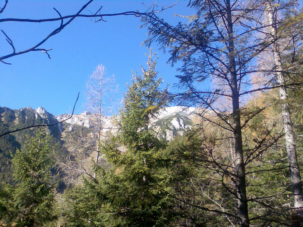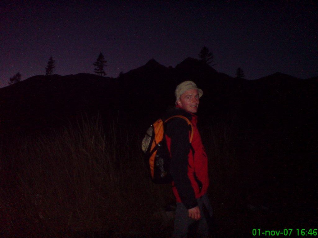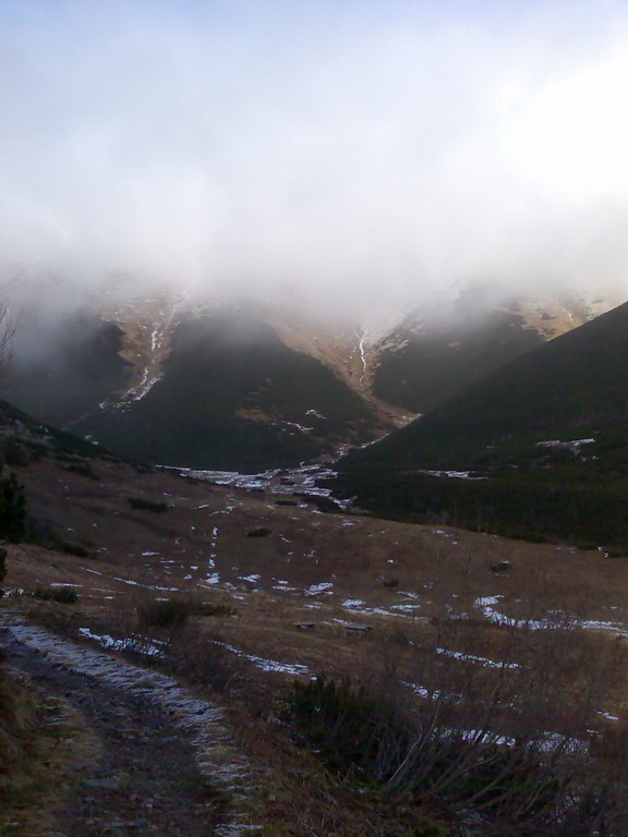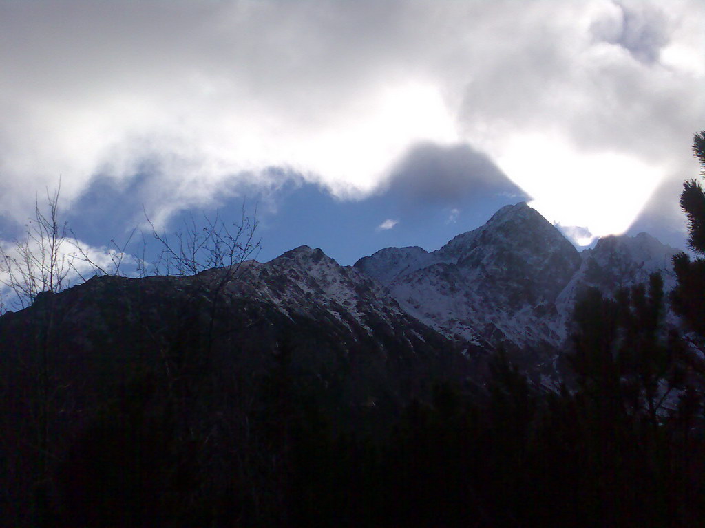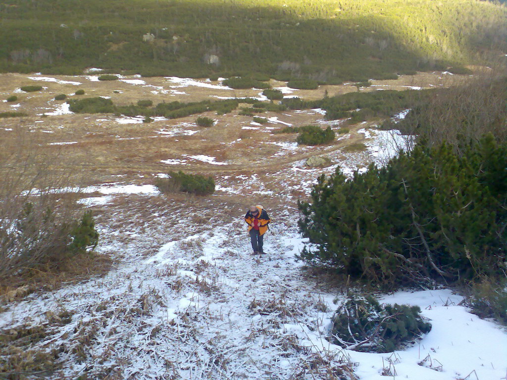 Belinda však bola na rukách a ani by nás nenapadlo, že uprostred prírody bude mať niekto problémy so psami. Tak sme si len objednali polievku a usadili sa pri chate. V kľude sme pojedli a asi po pol hodine došli aj naši rodáci. Trocha sme sa s nimi dali aj do reči, počastovali sme sa navzájom a asi po dvoch hodinách družnej debaty sme sa rozlúčili. Slnko sa schovalo za oblaky a citeľne sa ochladilo. Aj sme troška zapochybovali, či ísť ďalej, ale plán je plán. Chodník pokračoval prudkým traverzom v smrekovom lese s nádherným výhľadom na Skalné vráta a Červenú skalu. Stretli sme zopár oprotiidúcich kolegov a pomaly začali klesať. Postupne sa stromy začali zmenšovať a prechádzali sme Pastvinami. Na nešťastie bol hrebeň Belianskych Tatier v hmle a tak sme si nemohli vychutnávať výhľad. Značka prudko zabočila doľava a nastalo záverečné stúpanie k Veľkému Bielemu plesu /prevažne snehom/. Pri plese sme sa zohriali čajom z termosky a vzhľadom na pokročilý čas sme upustili od zámeru navštíviť ešte Brnčalku a vydali sa dole, k Šalviovému prameňu po modrej značke. Pohodlným klesaním sme pokračovali až ku Vyhliadke, kde sme odbočili na modrú, na Tatranské Matliare. Na ďalšom rázcestí, už za tmy sme smerovali do Tatranskej Lomnice. Aj napriek čelovkám sme stratili značku a cez polom smerovali ku Grandhotelu. Rúbanisko bolo plné výmoľov, mladých výhonkov stromov a vyvrátených pňov. Za normálnych okolností by nám táto vzdialenosť trvala 10 minút, ale v tme a zložitom teréne sme to šli asi pol hodinu. Konečne sme sa ocitli v Tatranskej Lomnici a keďže sme mali ešte času do odchodu vlaku, povečerali sme v reštaurácii U medveďa. Jedná sa o českú reštauráciu s veľmi milou a ochotnou obsluhou. Ako bonus ponúkajú zdarma aperitív - medovinovú slivovicu /vynikajúcu/ a k jedlu opražené kolieska rohlíkov so škvarkami alebo domácou masťou. Po jedle sme nasadli na električku do Starého Smokovca a presadli na vlak do Popradu. Po šiestej je mimo sezóny problém zakúpiť lístky a tak si treba pripraviť dosť drobných do automatu vo vlaku. V Poprade sme asi pol hodinu čakali na vlak a tak sme okolo deviatej večer boli doma, v Lendaku.