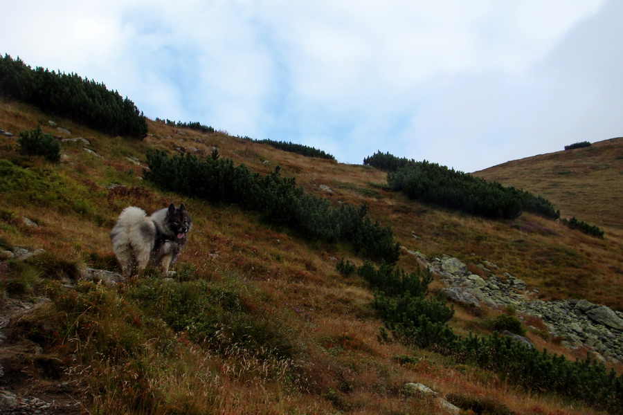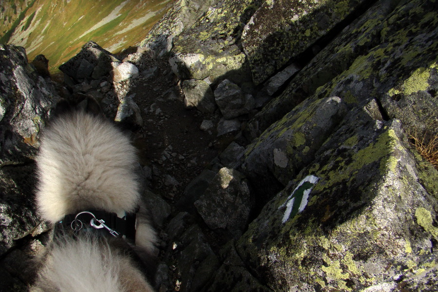 Zostup do sedla je technicky menej náročný ako zostup z Príslopu a preto cesta ubieha rýchlo. Na južnej strane svahu nerušene odpočívajú kamzíky. Hrebeň je zahalený v hmle, občas sa nám po pravej strane odkrývajú výhľady do Spálenej doliny. Po asi 20 minútach vidíme z hrebeňa smerovník v sedle a o chvíľu sme už pri ňom. Baníkovské sedlo spája dolinu Parichvost so Spálenou dolinou a 2 167 metrov vysokú Pachoľu s Baníkovom. Zo Spálenej doliny akurát vystúpala menšia skupinka prísne zoradených, technicky, ale pritom naľahko vystrojených turistov, ktorí bez prerušenia pokračujú na Pachoľu. Ja zo sedla trocha schádzam po modrej značke a usadím sa v závetrí vybudovanom z kameňov.