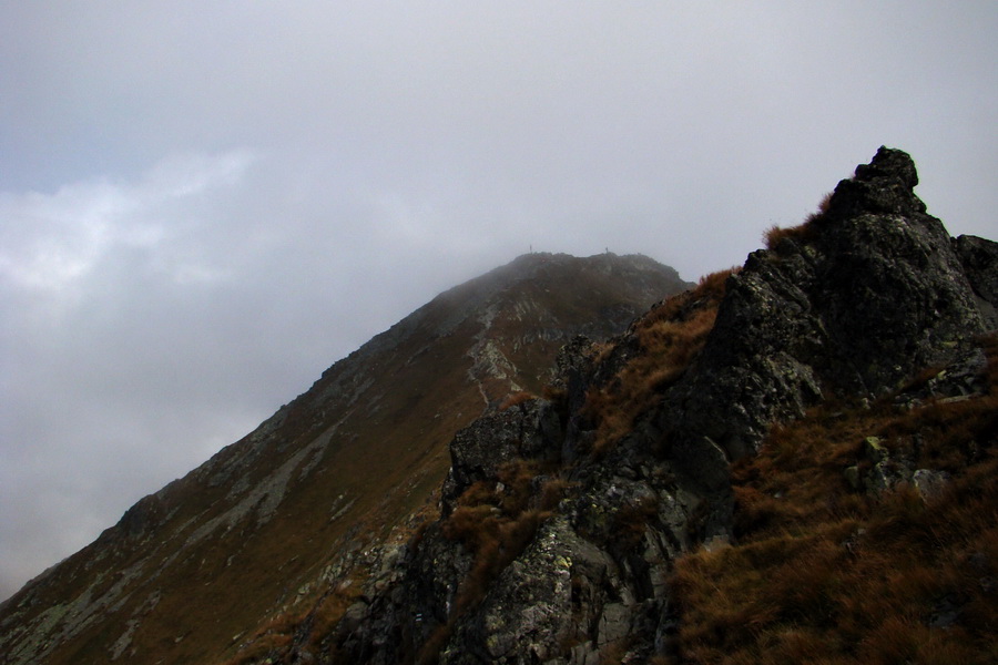 Je niečo po deviatej, Ati kňučí, že už chce pokračovať ďalej a tak začíname so stúpaním na Príslop. Skupinka pred nami stúpajúcich turistov už zmizla za horizontom. Po prekonaní cca 150 výškových metrov sa ocitneme na trávnatej plošine, ktorá vyúsťuje v záverečné stúpanie na vrchol Príslopu. Keď sa ocitneme na malom hrebeni končiacom samotným vrcholom, míňame skupinku vracajúcich sa turistiek. Pôvodne mali v úmysle z Baníkova pokračovať cez Tri kopy do Smutného sedla, ale kvôli nie veľmi vábnemu počasiu sa radšej rozhodli vrátiť už z Baníkova. Súhlasne pritakám, že počasie nevyzerá najlepšie a že sa správne rozhodli. Neuvedomil som si však, že vrchol pred nami, z ktorého sa práve otočili, je ešte len Príslop a nie Baníkov. Rozlúčim sa s dievčatami a pred desiatou sa celý vytešený uvelebím na vrchole. S Atim si urobíme vrcholovú fotografiu a fotím aj okolité výhľady. Po chvíľke mi dochádza, že keď som bol na Baníkove naposledy, vyzeralo to tam trocha ináč. Záblesk poznania, kolieska sa pootočia, zacvaknú a pochopím, že toto je ešte len Príslop. Pomerne prudko zostupujúci chodník, o ktorom som si pôvodne myslel, že smeruje do Baníkovského sedla je len hrebeň pokračujúci na Baníkov. Hmla sa definitívne začína rozchádzať a na konci hrebeňa sa vynára aj vrchol Baníkova.