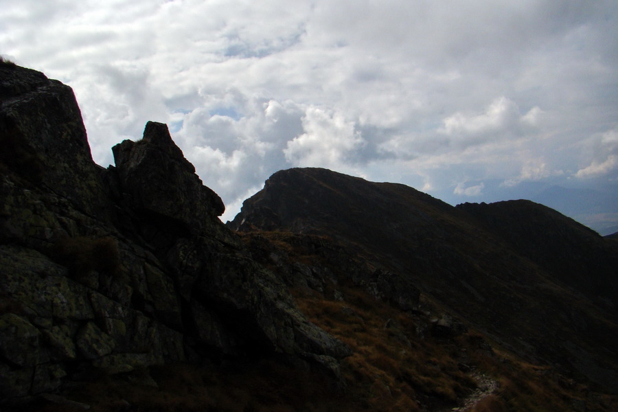 Zostup z Príslopu vedie skalnatým terénom. Zelená značka sa nachádza na dobre viditeľných miestach skalných brál. Keďže ma sprevádzal verný štvornohý spoločník, volil som radšej nižšie položený a bezpečnejší chodníček ako mierne lezecký terén. Po zostupe do najnižšieho bodu hrebeňa už výstup pokračuje nenáročným stúpaním. Stúpame ešte asi desať minút a konečne sme na najvyššom vrchole hlavného hrebeňa Západných Tatier - Baníkove. Baníkov sa opäť ocitá v hmle, takže českých turistov hľadajúcich "kešku" niekde smerom na Tri kopy je viac počuť ako vidieť (žiaľ ;-)).
